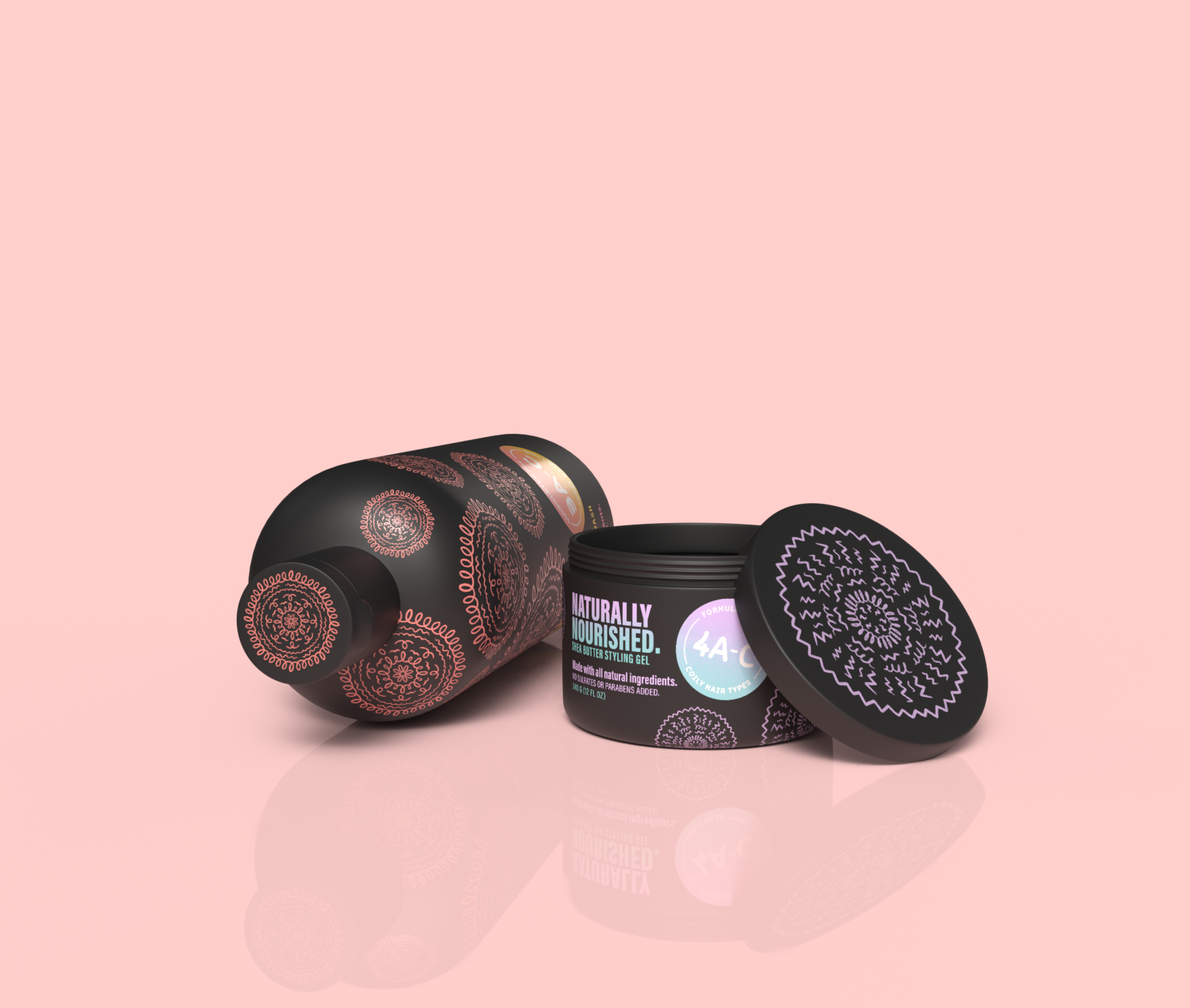 Initially, I wanted to show the curl patterns on the bottles so people could visually see the similarities their hair had with the packaging. However, that direction didn’t lead to anything exciting. Instead, I created mandalas that contain specific curl patterns designated to what hair type they cater towards.